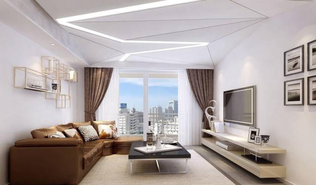 直线吊顶类似顶角线,但顶角线更窄、更细,而直线吊顶的宽度多在30-45厘米之间,厚度多在8-12厘米之间。适合房高2.6米左右,四四方方的空间,在现代简约装修风格中较为常见。